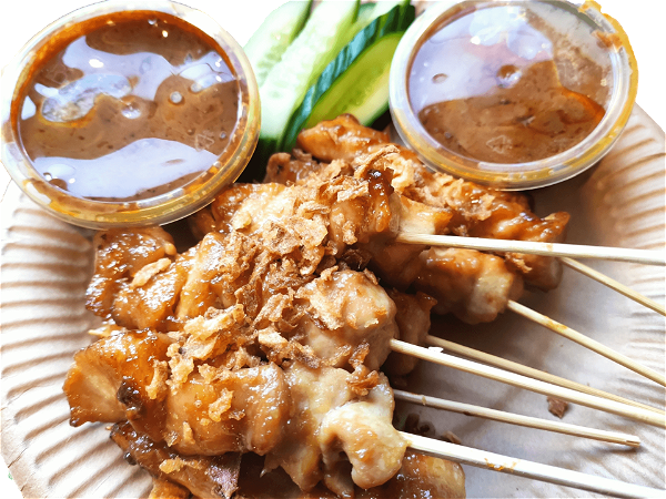 Grilled marinated chicken skewers, Served with a homemade creamy peanut sauce and fried onions as topping.